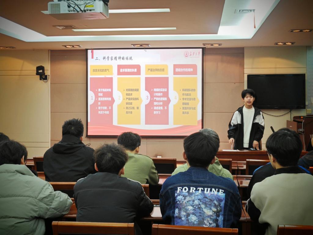 在分享环节,支部党员上台分享了学习邓稼先、程开甲和钱学森三位杰出科学家的感人事迹与深刻感悟,并表示要将个人志向与追求融入到党和国家的宏伟蓝图中,为祖国建设添砖加瓦,为时代进步倾注青春热忱。