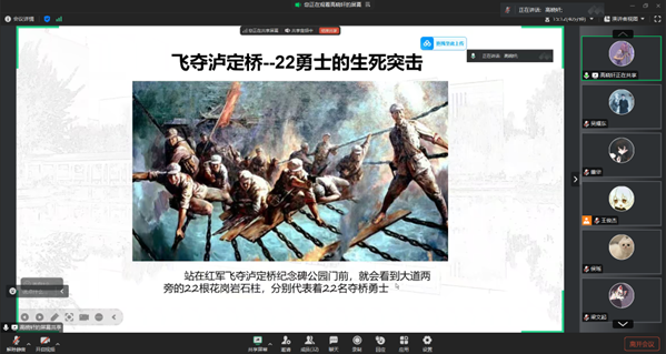 本次分享人为21级王永鑫,他介绍了22名勇士生死突击飞夺泸定桥的英勇事迹。在中国历史的长河中,飞夺泸定桥的事件以其惊险而悲壮的故事深深铭刻在人们心中。1928年,红四军在长征途中,为了确保大渡河的成功渡过,22名年轻的战士在几乎不可能的条件下,夜袭了泸定桥,创造了令人惊叹的历史奇迹。这一英雄壮举不仅是一次战术上的成功,更是信念与勇气的象征,至今激励着无数人。