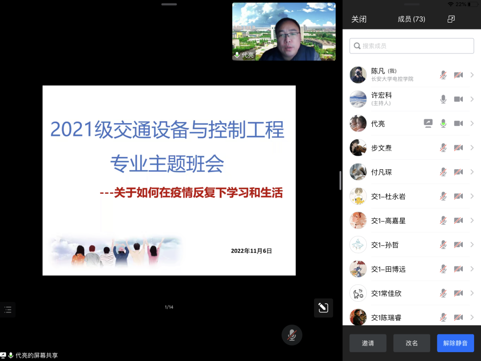 为了帮助同学们在当前校园疫情防控常态化形势下,积极地调整自己的心态、更好地投入到学习中去,2022年11月6日19时,2021级交通设备与控制工程专业1、2班举办了“疫路同心,共赴未来”主题班会。班主任代亮和辅导员陈凡出席本次会议,会议由班主任许宏科主持。