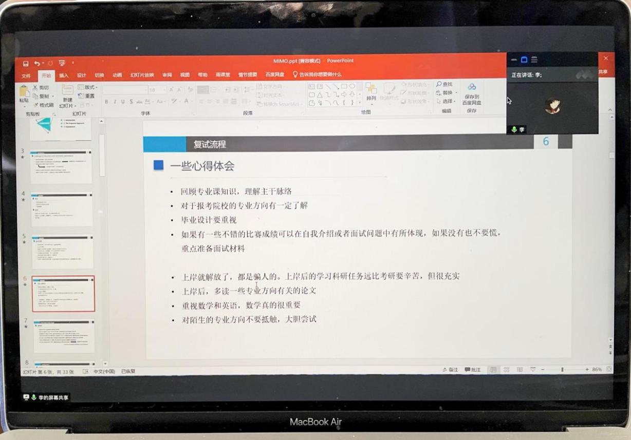 九名在读硕士研究生结合自身经历,分享了自己在所在学校的复试经验。其中,西北工业大学控制科学与工程专业研究生冉汉阳同学针对专业复试科目、英语面试及联系导师等方面的细节做了讲解。
