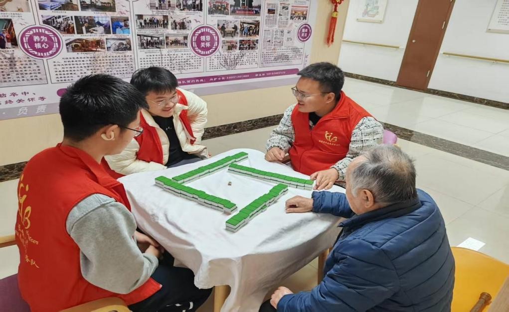 清洁工作结束后,志愿者们在活动室与老人们展开趣味互动。象棋桌旁,青年学生与老人“楚河汉界”间切磋棋艺;麻将桌前,欢声笑语不断。志愿者一边陪老人下棋,一边耐心讲解规则。