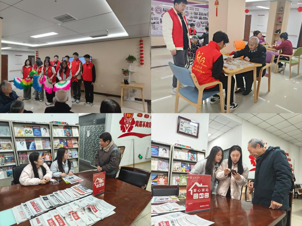 聚焦银龄关怀,传递温暖力量。弘扬尊老敬老传统美德,学院组织志愿者深入社区与养老机构,开展“青春暖夕阳,志愿传温情”养老院志愿活动,通过打扫房间、陪伴聊天、文艺表演等形式为老人送去关怀;针对离退休老教师面临的“数字鸿沟”问题,开设每周一次“爱心驿站”志愿服务活动,一对一教授智能手机使用技巧,助力银龄群体融入智慧生活。