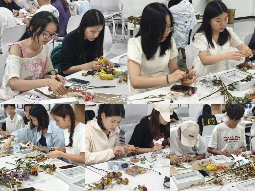 实际操作环节,同学们精心挑选心仪的制作材料,充分发挥想象力及创造力,认真修剪枝叶、调整花朵位置,沉浸在艺术创作的世界中。同时,同学们也在交流经验、分享创意的互动中拉近了彼此的距离,活动现场充满欢声笑语。经过一个多小时的制作调整,一件件精美的干花作品呈现在大家眼前,每一件作品都凝聚着同学们的巧思与创意,承载着个人的情感与期待,展现出独特的风格和魅力。