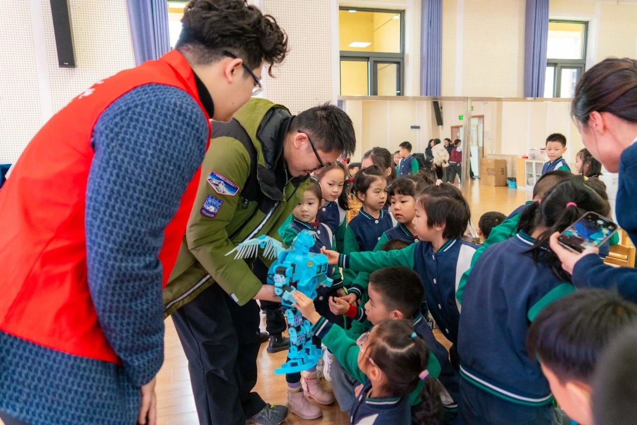 创意小机器人模型参观环节,孩子们观看、触摸机器人,与机器人亲密互动,在亲身体验机器人的魅力和风采的同时深刻感受来自科学技术的神奇力量。展示过程中,志愿者们耐心地解答孩子们提出的问题,鼓励他们勇于探索未知的世界。