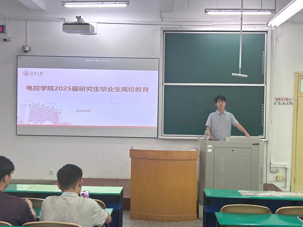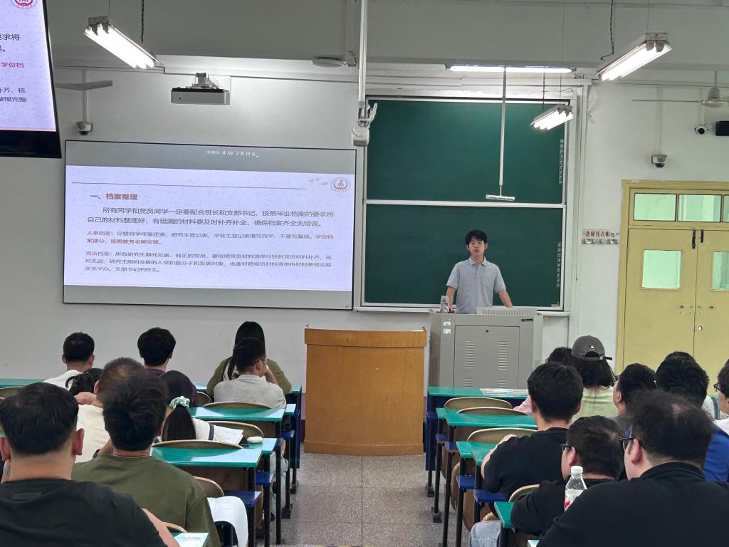 在南校区北院b281教室召开2025届研究生毕业生离校教育大会,毕业班辅导员王佩佩主讲,2025届全体毕业研究生参加。