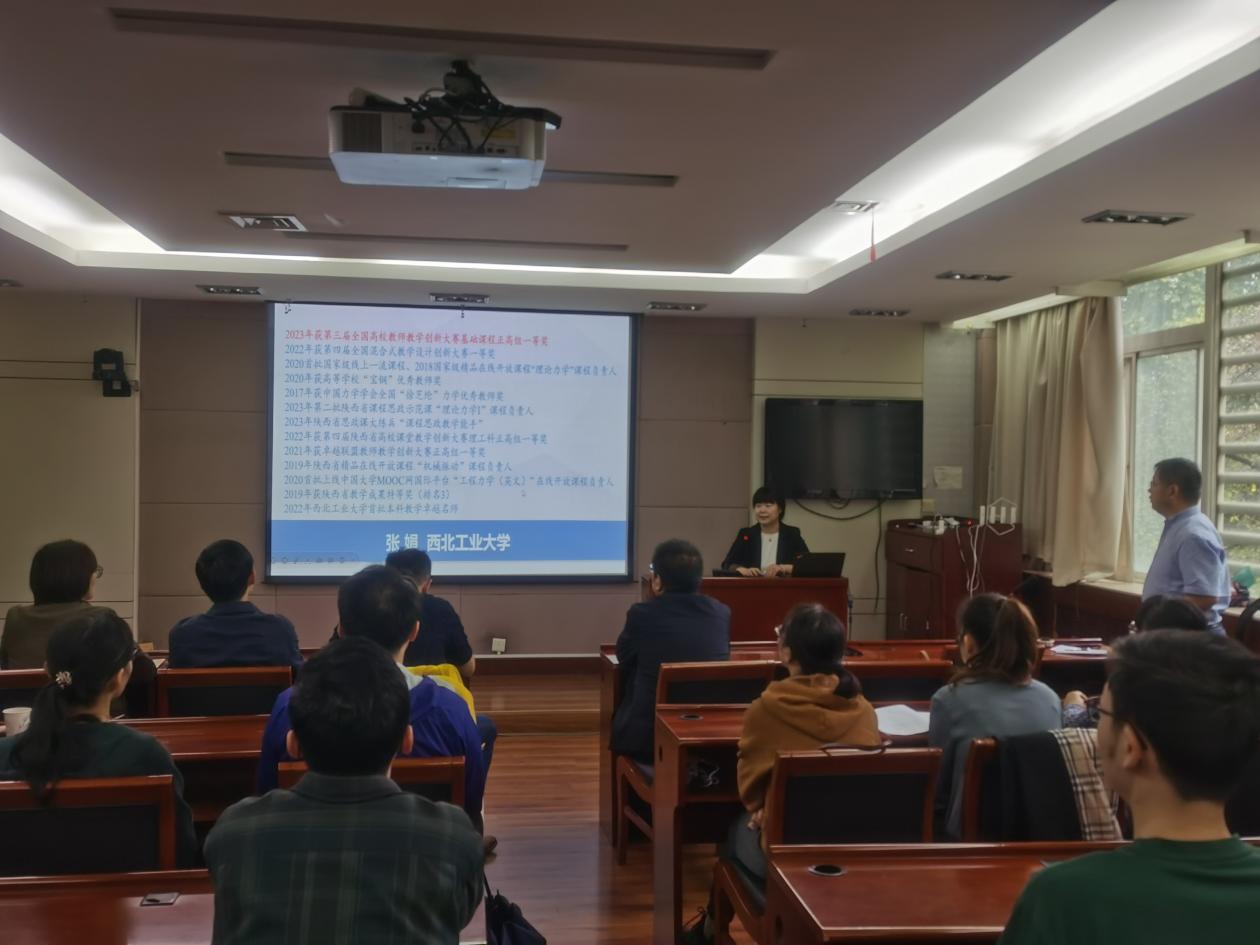 西北工业大学张娟教授受邀作了题为《一流本科课程建设与申报经验分享》的专题报告。在解读一流课程评价标准的基础上,从找准课程痛点、明确解决方法、展示取得成效、凝练特色与创新、理清建设思路等方面,梳理了一流本科课程的申报逻辑。同时结合自己负责的国家级一流本科课程《理论力学》的教学改革与实践,介绍了包含案例库、虚实结合的实验体系、动画视频库、中英文教材库等“数字化教学资源群”的建设与“四堂融合”的教学模式,并通过丰富多彩的翻转式、探究式的教学实践展示了教学改革实施的方法以及教学效果。