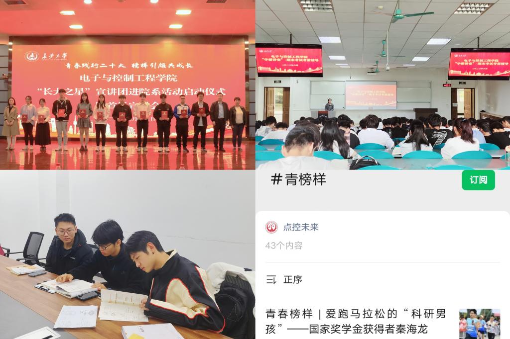 坚持典型示范,发挥榜样“引领力”。坚持培育、挖掘、选树、宣传先进青年典型有机衔接。注重朋辈帮扶,学院选聘119名学业帮扶志愿者,且符合条件的学生党员全部参与,共开展结对学业帮扶23次,开展经验分享会、“学霸讲堂”“电控青年说”“帮扶晚自习”等特色活动30余场;讲好榜样故事,学院微信公众号“点控未来”推出“青春榜样”风采展43期,以先进典型引领学风建设“风向标”;“点控未来”入选“高校思想政治工作200个最受欢迎公众号”。
