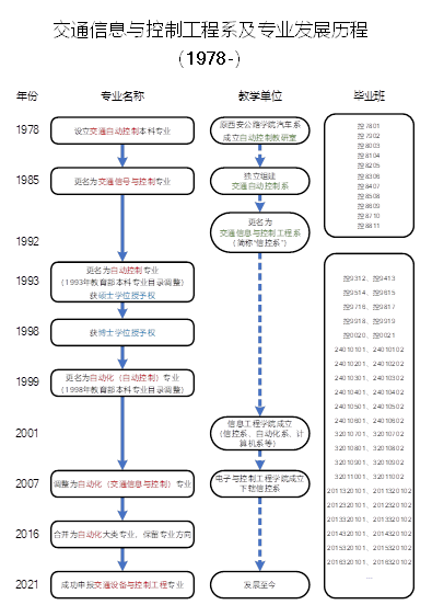 依托公路交通领域行业优势,交通信息与控制工程系是国内最早设立交通设备与控制工程相关专业的高校之一。1978年设立交通自动控制本科专业,1985年更名为交通信号与控制专业,1993年根据教育部本业专业目录调整为自动控制专业,1999调整为自动化(自动控制)专业,2007调整为自动化(交通信息与控制)专业,2016年纳入自动化大类招生,2021年获批设立交通设备与控制工程专业。1993年、1998年分别获得交通信息工程及控制学科硕士、博士学位授予权。交通设备与控制工程专业方向办学近50年来累计培养60多个本科毕业班,为国家公路交通建设事业输送了大批高层次工程技术及管理人才,这些毕业生广泛分布于各省市公路交通科研院所、高速公路运营管理部门、智能交通研发中心、机电工程集成等企事业单位。