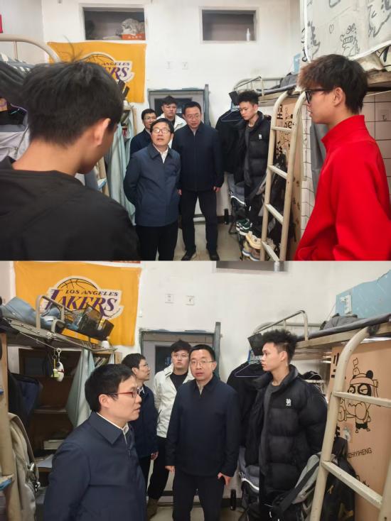 随后,谢花林走入学生宿舍,与同学们亲切交谈,详细询问大家的学习生活、饮食起居、专业训练及就业意愿等情况,仔细查看了宿舍环境卫生、住宿条件、安全设施等,倾听同学们在校园生活、学习发展中遇到的困难和诉求。同学们敞开心扉,围绕课程设置、场馆开放时间、后勤服务保障等方面积极建言献策。谢花林耐心回应同学们的疑问,鼓励同学们珍惜大学时光,刻苦钻研专业知识,加强体育锻炼,积极参与社会实践,全面提升综合素质。他叮嘱同学们要注重宿舍安全,保持良好的生活习惯,相互关爱、共同进步,营造和谐友爱的宿舍氛围。